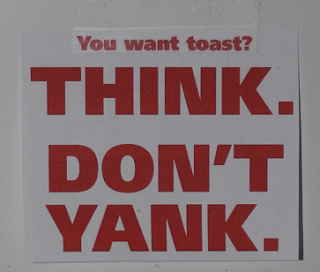After 58 years, my toaster is a little temperamental. You kinda have to watch it. But I was nuking my egg,and kind of forgot. Next thing I know, the kitchen is filling with smoke from my charred toast. The bent corner of bread was kind of touching one of the heating elements. So, panicking, I yanked the plug. Only ... the plug stayed in the socked, and I only held the cord in my hand.