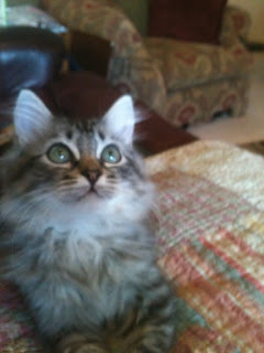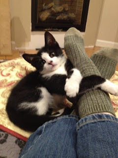 Then there's the 6 month old Lynley. He is, as all kittens are, adorable. He loves to play goalie in a game of roll the treat toward him. He can also jump on top of a flat screen TV and balance there.