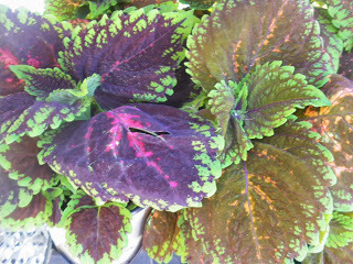 Here are the first two baskets: For the first, I picked out a coleus with a lot of spicy red and dark dramatic borders