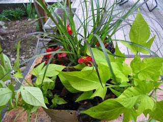It’s the first time I’ve seen this variation in the local shop. I decided to surround the fescue with small red begonias. I love them and they’re tough little devils. I also love the lime-color of the sweet potato vine.
