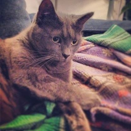 Sometimes a cat might prefer to relax in a laundry basket with a purple blanket, looking regal. That's King Siggy, holding court. We humans are his loyal subjects.