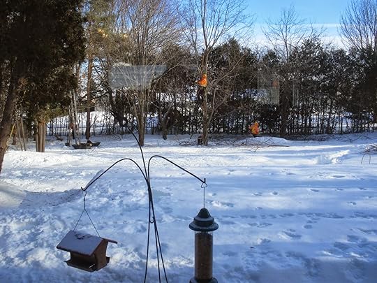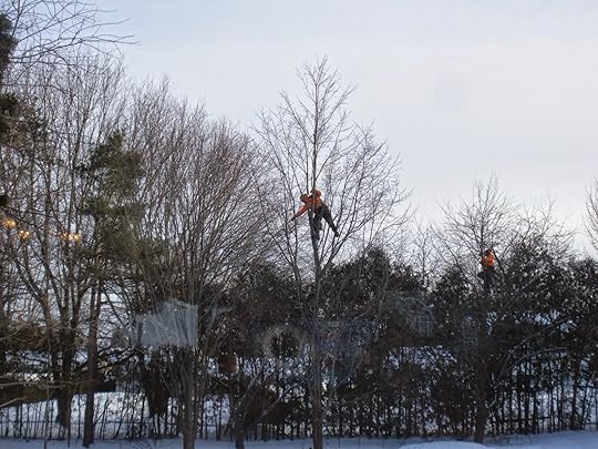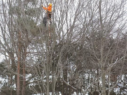 There’s something magical about a bright blue sky, brilliant white snow swirling around. You never know what you’ll find when you look out your window. Last year it was men in trees. Here are some shots of what the tree removal guys who were endlessly entertaining, although I wouldn't want that job. Still,it was part of winter fun for us. They claimed to love their jobs.
