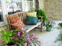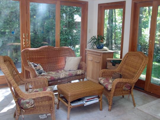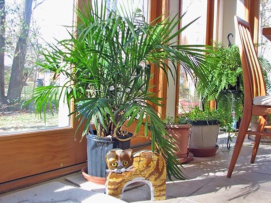 Where else do the cats like to hang out? Well, there's a nice front porch, but since my cats are all indoor cats, they just glimpse it from the bay window in the living room. Occasionally squirrels clamber up on the wooden bench and peer inside, to taunt them.
