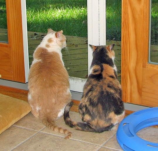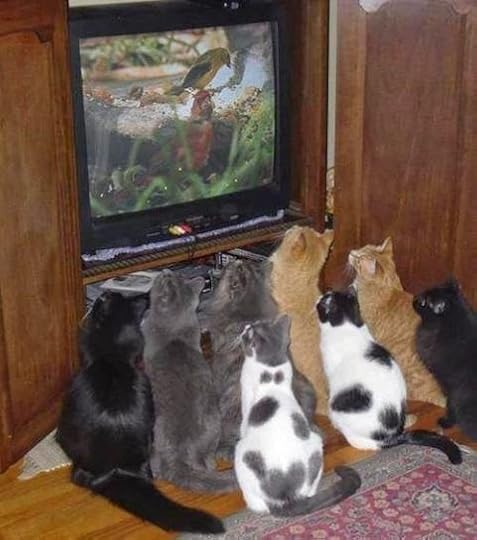 Sometimes the cats disagree about what they want to do. It can be a beautiful sunny day out and some cats prefer to stay inside and watch bird videos on TV. (Even though I've warned them too much TV will rot their brains!) They're seriously addicted to bird and fish videos.