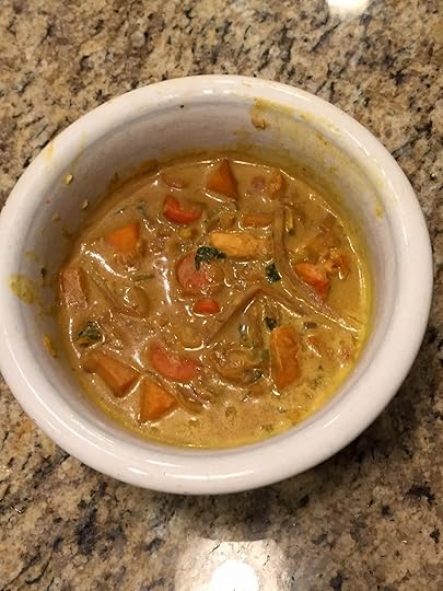 Chop onion and let it sit for at least five minutes to bring out its health benefits.Heat ½ cup broth in a medium soup pot. Sauté onion in broth over medium heat for about 5 minutes, stirring often.Add garlic and ginger and continue to sauté for another minute.Add curry powder or turmeric and mix well with onions.Add broth, carrots, sweet potato (squash), (other veggies, meat optional) and simmer on medium high heat until vegetables are tender, about 15 minutes.Add coconut milk.Add salt and pepper to taste.