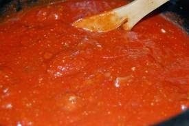 Here's what I use for the topping. I start by spreading 1/4 cup of sauce on the pita--it can be spaghetti sauce, it can be tomato sauce, either home-made or from a jar, whatever strikes your fancy.