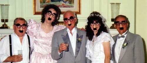 This picture is from MY wedding. At left, our best man Danny, my maid of honor Anne, my dad, me, and Mr. L. (Honestly, Mr. L and I are the same height, but that day I wore heels -- and probably for the last time, too.) Um...we kind of have a tradition in my family of wearing crazy nose-and-glasses for special occasions. (Doesn't everyone?)