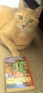 Several cats decided to start at the very beginning of the the Booktown series with Murder Is Binding. That's Debbie L's cat Smithie. She says she can't get enough of the Booktown Mysteries!
