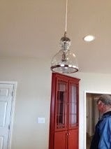 Here's one of my very favorite light fixtures. There are three of these over the island and they have old fashioned bubble glass and "Edison" bulbs. You can see my pretty corner cabinet in the background.