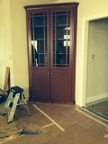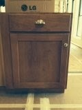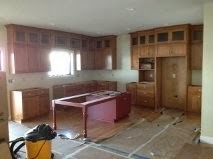 but--isn't there always a but?--they did not do glass in the upper cabinets as I'd requested. If I had been happy with the look, I might have let it slide and been satisfied but it was just too much wood. My dear husband spoke up, even though I was the one who had been dealing with the cabinetmaker. I am grateful since I have been suffering with a very messed up back and neck and I feared I might have burst into tears if it was a tense conversation. Turns out it wasn't. The cabinetmaker was wonderful and took back all the top cabinets and replaced the doors. Here are the before and after pictures.