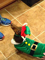 Here is Oscar in his Christmas costume for Serena's annual Christmas party for friends and their families. The kids get her entire tree decorated while consuming a plateful of homemade cookies: