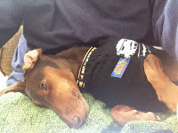 When daughter Serena sent me these photos of a close friend's miniature Dachsund, Oscar, I knew right away I had to share them. The Cozy Chicks Blog seemed the perfect format. I met Oscar over the Thanksgiving holiday. He is truly adorable. All he wants to do is snuggle with you. You sit down, and Oscar jumps right up beside you and snuggles next to your leg and---if he can---put his little head on your lap for a rub. Oscar had to adjust his position in order for me to work on my laptop, but we did it. Oscar was a rescue doggie who had been abused. How in the world can people do that? He'd had a couple of ribs cracked, by a kick probably. Serena's friend found him trembling at the back of the Rescue mission's cage. And Oscar responded to the affection----big time. :) Life has been good for Oscar ever since, and for anyone who meets him.