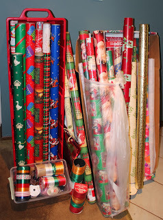 Just part of the stash.As someone who worked in retail for 12 years, I loathe full-price for anything. I hit the after-Christmas sales, and also stock up on stuff at yard sales. Consequently I have tons of rolls of wrapping paper, and enough curly ribbon (in many colors) to reach to the moon and back several times.