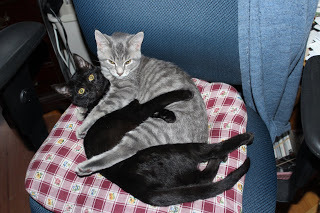 At first, Emma was aloof and Poppy was the lover. (She still is, but on HER terms.) It took Emma a while to warm up to us. She's only now learning to be a lap cat (and it seems ONLY when I'm sitting in the family room editing the day's work. Go figure.) But over the summer, Emma decided that I am her human. She is with me at least 22 hours of the day. She sits beside me (in the other chair) in my office. If I get up, she gets up. She follows me like a puppy. If she's out of sight and I call, she immediately comes running. At night, she sleeps either at my feet, or next to my pillow.