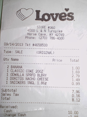 It’s a receipt for a pit stop we made awhile ago. 2 bananas, a bottle of Coke, 1 blueberry Odwalla smoothie, 1 bag of Doritos, and 1 Snickers bar.