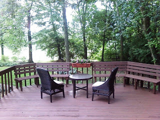 I've been sitting outside on the wide decks and the yard and working----while I watch the wildlife. :) I was delighted to hear all sorts of birds singing and chirping early in the morning, in a tree right beside the deck. My favorite bright red Cardinals (Virginia State Bird) and I swear I saw an Oriole, yellow and black, singing away. Brought me back to my childhood. I've also met several of the neighbors who live along the block beside the river, as well as my super-helpful and friendly neighbors across the wide grassy yards, Gloria & Ray. Lots more yard to mow. :)