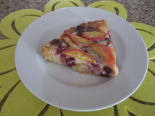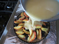 Place blackberries and peaches on shortbread crust. Transfer to lined cookie sheet and then pour filling over the fruit. The filling will reach the top. Bake until center is set, 55- 60 minutes depending on the strength of your oven. Cool, remove from tart pan, and enjoy.