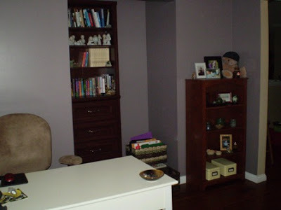 This week I had to choose a color for my office. My office at the old house was yellow, and I was ready for a change. I brought home a couple of paint swatches and fell in love with "Plum Smoke." It's a deep grayish purple. But it was darker than I thought I wanted, so I kept trying to steer myself toward the spring greens. Yet I always went back to that purple. So I decided to give it a go.
