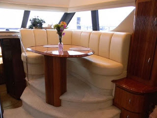 It's got THREE staterooms (the master has a queen-sized bed); two washrooms (with showers); two Volvo engines; a 450 gallon fuel tank (it runs on diesel--can you imagine what it would cost to fill that sucker at marine prices?); a mini kitchen with coffee pot, microwave, and two-burner electric range; a mini living room (called the salon), with creamy leather furniture. The boat I saw had two TVs, but no books. (I prefer to think they catch up on their reading with a Kindle, Nook, or Kobo reader.) And up on the flybridge (where you steer the boat) there's a table, chairs, fridge (with ice maker), and wet bar.