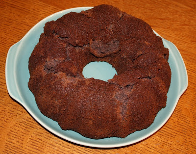 As you can see, the cake did NOT want to leave the security of the bundt pan and came out in pieces--about six of them. And the recipe called for it to be baked for between 40-50 minutes. I decided to go halfway and bake it for 45 minutes. My oven is pretty accurate and ... 40 would have been better than 45. It tasted pretty good, but did not look good. And the next time I bake it (and I will bake it again), I think I'll add walnuts. I like a cake with walnuts.