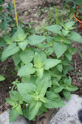 About 17-18 years ago, I bought a catnip plant at the grocery store. It has been self seeding all around the yard ever since. This is just one stand next to the tomatoes. We don't pull them out, though. We let them grow (and these will get another week or so) and then dry them so the cats can enjoy catnip all winter. (You'd be surprised how much catnip Chester can eat.)