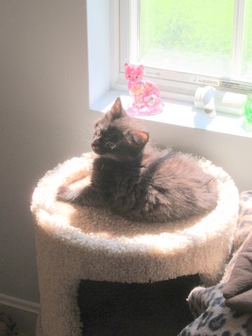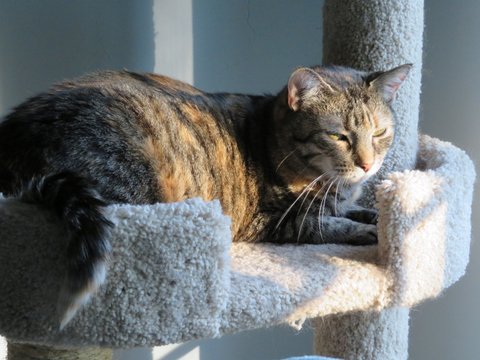 The furry members of the family also seek out sunshine, not only during the summer but all year round. They seem to enjoy its warmth and understand its health values. Sometimes they gravitate toward one of their condos where the sun shines through the nearby window and provides light and warmth. Other times, a slash of sunshine escapes through a lowered blind or through the high windows on the front door. They seem to find those sunny spots.