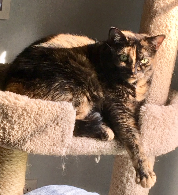 Halo will sleep anywhere but she especially enjoys snuggling against me or my husband in the bed or on the sofa. Her aging bones also seem to benefit from the warmth of the sunshine on the window condos.
