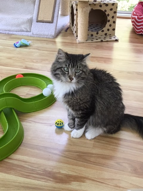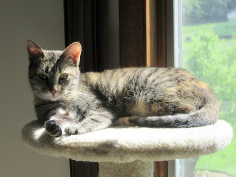 Freya, Zander's sister enjoys a sunny condo but she also spends a lot of time each day on a chair in the dining room listening to and watching birds dance through the bushes outside.