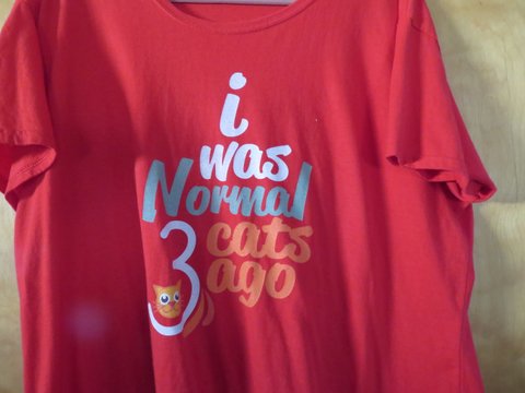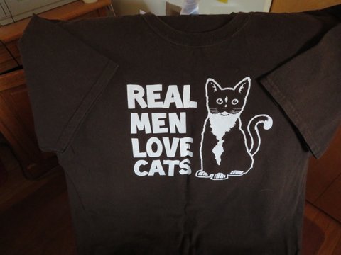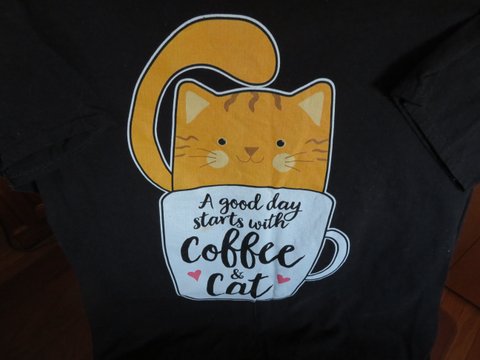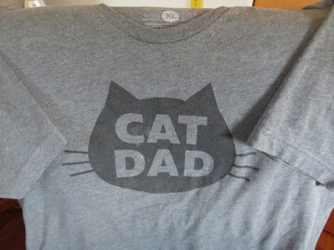 When my husband was still working, I often gifted him with neckties that had a feline theme. Since he retired, my gifts switched to T-shirts. He has become much more involved with our furry family since he is around them all day. I often try to combine other favorites of his with the feline themes. Retirement and coffee teamed up well with cats on my most recent finds. He often returns home from running errands and says that he received a comment on his T-shirt.