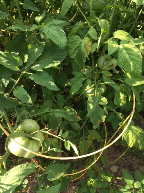 The past two summers, groundhogs and deer have helped themselves to my giant sunflower plants, so this year I planted the sunflower seeds in the center of the raised tomato bed where they are protected by the tomato plants and cages. They are now peeping over the tops of the vegetable plants and will soon be in full bloom.