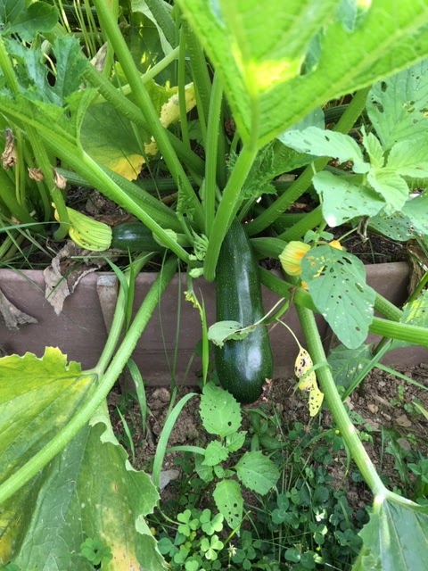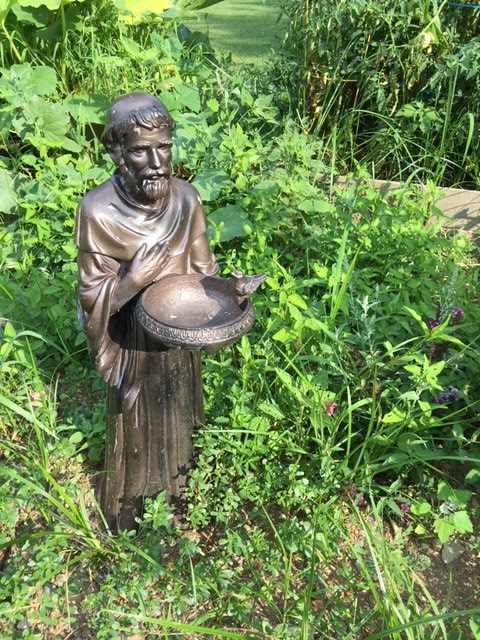The garden sometimes needs a splash of color, so I always plant a row of zinnia seeds around Memorial Day and they also burst into full bloom around the same time that the garden starts to produce. My St. Francis statue stands guard over the garden, welcoming creatures who need protection.