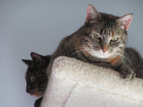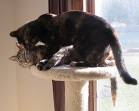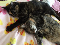 We had no idea when Halo appeared on our patio that she would teach us so many lessons in parenting, motherly devotion and showing appreciation for being accepted into our family. She is the sweetest feline and is totally happy just snuggled against either my husband or me whenever we settle on a cozy chair on on the bed. Paddy has her own personality and likes to snuggle on a condo by herself...but usually close to her mother.
