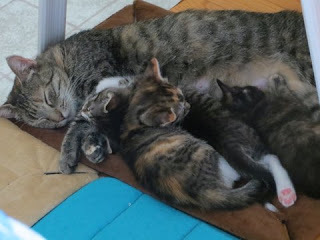 Halo had her kittens under the desk in my office and my husband and I will never forget the experience. She gave birth to three kittens as we watched. The first born, who we thought looked like a little bear (hence her name Miss Paddington), had trouble latching on to her mother to suckle. So we assisted to make sure she was nursing as much as her two siblings. We found forever homes for the other two kittens in the litter and kept Halo and little Paddy.