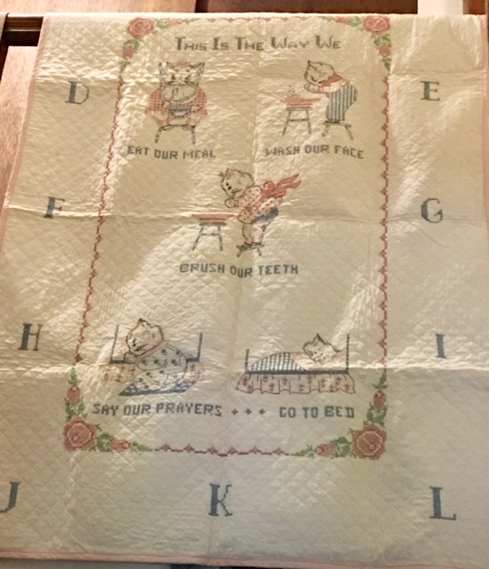 First, there were some of my baby clothes as well as our son's -- embroidered kimonos, crocheted baby booties, the receiving blanket we wrapped our son in the day we brought him home from the hospital, the embroidered crib quilt that was used in both of our cribs. The items brought back many happy memories and, of course, were carefully folded and replaced on the top shelf of the closet.