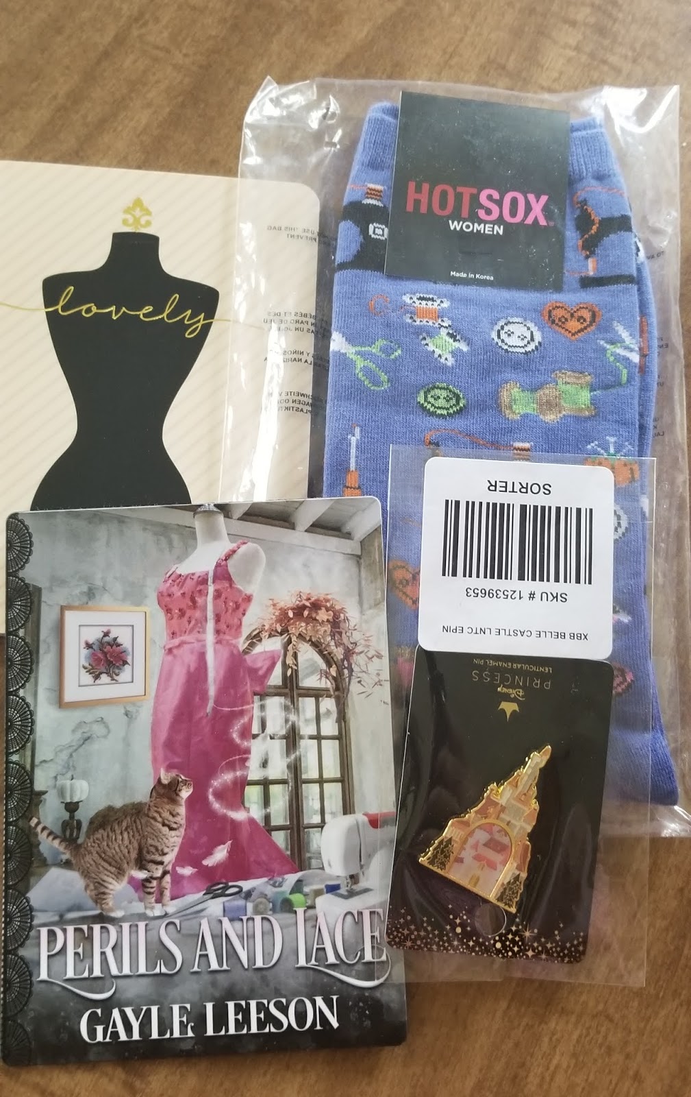 Since PERILS AND LACE revolves around a high-school production of Beauty and the Beast, I'm giving away a Ghostly Fashionista prize pack: a PERILS AND LACE magnet, a Beauty and the Beast pin, a "lovely" notebook, and sewing-themed Hot Sox. Unfortunately, this offer is available only to U.S. readers.
