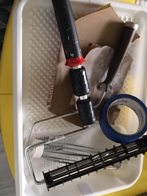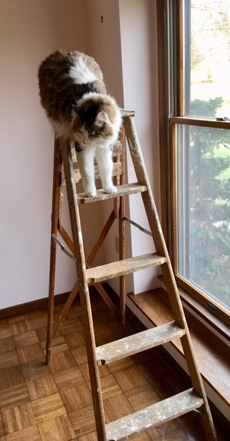 Before my husband began painting, we discussed closing our five cats into my office and a bedroom. They get along better with Paddy and her mom in one and the two kittens (18 months old) and Zoie in another. Just like humans, they have their cliques. But hubby thought three of them would wander off to other rooms and the kittens would probably stay with me upstairs. They didn't. But they didn't get in the way either. They watched...every move hubby made. Freya tried to climb the ladder as Zander had but the paint tray was on top! My husband saved it.