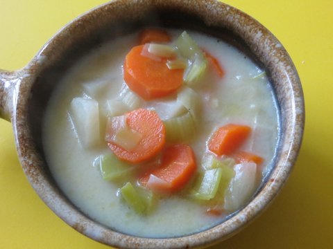 In a 4 1/2 quart pot, heat sunflower oil and saute onion, leeks and celery for about three minutes. After the mixture starts to sizzle, add garlic. Add flour and stir well. Add chicken broth and bring to a boil. Add potatoes, carrots, bay leaf, salt and pepper. Bring to a boil again, then simmer until potatoes are tender (about 20 minutes). Add milk and simmer 5 more minutes.