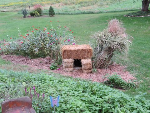 My husband just picked up this year's straw bales.We use straw bales as buffers and protection for the shelters against the elements. Since the flowers are gone and plants don't provide much cover, the bales are also useful on the patio to break the wind.