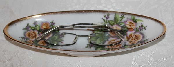 But I have come up with a bit of a solution for my my glasses and that is (are) relish trays. I get them at yard sales and pay between 25 and 50 cents a piece. I have them in the kitchen, my office, the living room, the dining room--anywhere I tend to read.