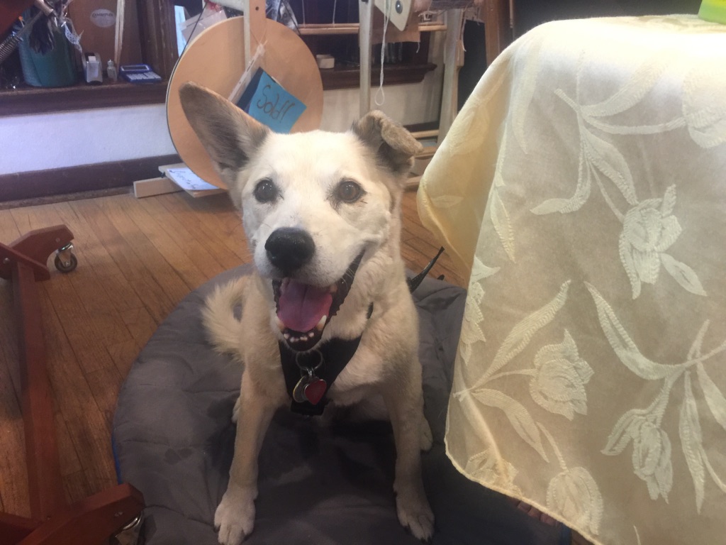 Okay. . .I hope I'm not putting anyone to sleep, but those thoughts simply came in strongly so I figured I should share them on my post today. And. . .a fun photo. This cute puppy visited the Fort Collins knitting and yarn shop, Lambspun, one weekend in late July. If you're wondering what that strange looking item is that's sitting on the floor behind the doggie, that's one of the marvelous spinning wheels that spinners use nowadays.