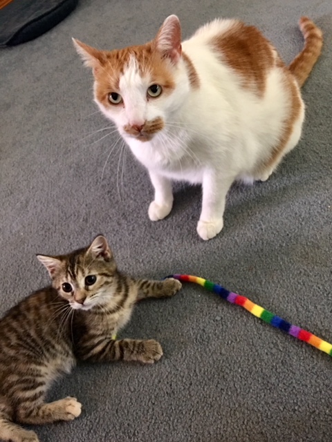 I've had friends call me for cat advice. (That's how we ended up with two kittens last summer.) When my college roommate who lives about 45 minutes away adopted a kitten in her yard a few weeks ago, we went to visit. Her grandkids had found the kitten and named her Dottie. She has dots all over her tummy. Our friend has an older cat Baler who is about nine, also a rescue. Before a vet visit, Dottie was living on the screened in porch and Baler inside. However, my friends were going on a planned vacation. Baler and Dottie would be inside together. Fortunately, from the beginning they got along. Yes, Dottie annoyed Baler but, as a big brother should, he put up with her antics.