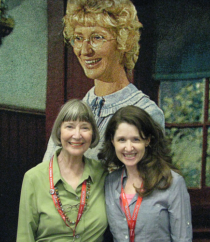 That's right! I MET MISS BEADLE! Charlotte Stewart, the perfectly lovely actress who played Laura's beloved teacher on Little House in the Prairie, was there at a table in the convention hall, and I totally geeked out when I saw her. Got speechless and stammery and gushed like crazy. And she was so nice and friendly and warm, and I am thrilled to bits to have met her. I told her about my books, and she told me about the Little House Reunion Cruise that is happening in November, with Charlotte, and the hilarious Alison Arngrim (Nellie Oleson), and Lindsay and Sidney Greenbush (Baby Carrie), and Dean Butler (Almanzo), and ohhhh how much would I love to go?!