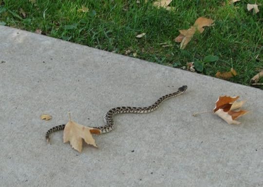 Rose and Beanie spotted him at the same time—they were in the lead, fortunately; they’re sharp-eyed lasses and I was distracted by a hot, red-faced, cranky Huck. If this had been the part of the trail where Huck suddenly charged ahead and we larger folk had to scramble to catch up, he’d have been on that snake before any of us saw it. It was lying quite still at first, stretched out across our path. Rose had just enough time to ask “Is it real?” before it twitched, and I took in the triangular head and the rattle and hollered EVERYONE BACK UP IT’S A RATTLER GRAB THE LITTLE ONES!! (I used more exclamation points.)