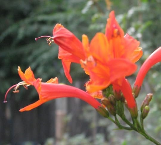 The hibiscus bushes are blooming in all the neighbors' yards, giant hedges of them. Ice plant with its many-skinny-petaled flowers, a brash magenta. Cape honeysuckle—there's a big one in our backyard, a tree really—thick with orange trumpet flowers the hummingbirds love.