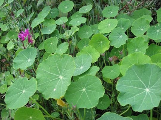 In the schoolyard behind us, the sunflowers are tall. I forgot to plant any in our yard until last week—Rilla helped me. We just grabbed a handful from the birdseed bin. We've got nasturtiums coming up all over the place. I love their leaves almost as much as their flowers—like lily pads for our ladybugs.