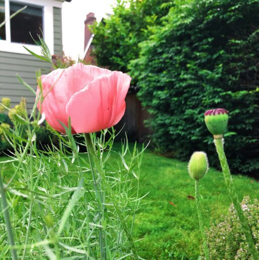 In bloom: rhodendrons, gloriously. One poppy was unfurling in my back garden this morning—I need to go see if it’s awake! And roses, oh I’m swooning over the roses I inherited from my neighbor last fall—eleven large potted rosebushes, every color.