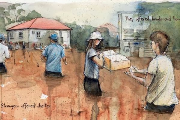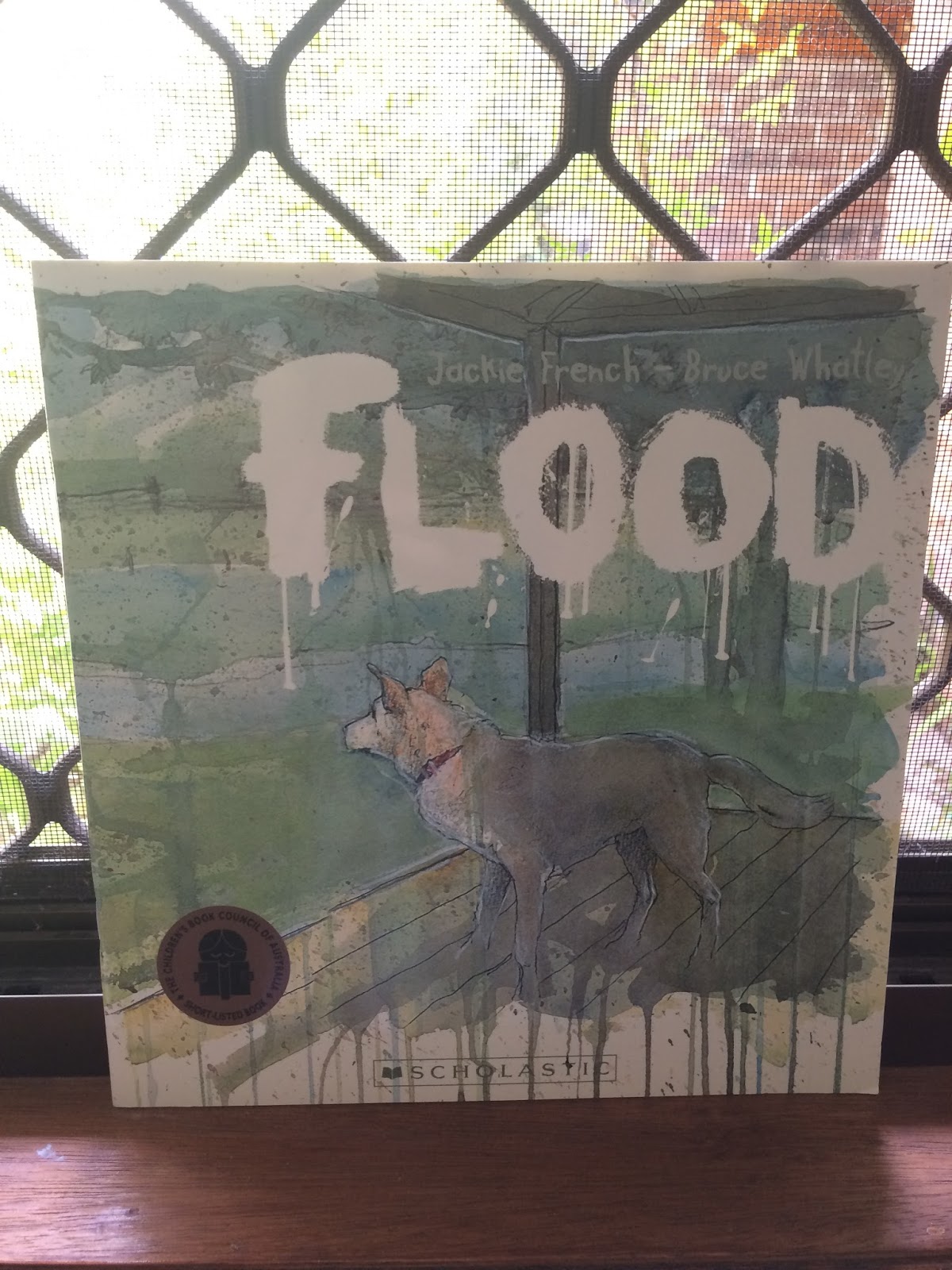 I remember looking out of this window in 2011 at the rain that just wouldn't stop. Our yard was flooded but thankfully as we live on the side of a hill, our house was not. We had trees that had fallen down and the end of our road was covered in water and we couldn't get in or out. We were one of the lucky ones though. It could have been much worse.The picture book Flood by Jackie French and Bruce Whatley is inspired by the 2011 Queensland floods but it could be about any of the disasters and events that turn everyday Australians into heroes. I love that it is told from the perspective of a cattle dog who is separated from his family. We adopted two dogs who were orphaned in the flood. Danny, a blue cattle dog and Darcy, a black kelpie, are still terrified of water. Flood helps children to understand the affects of a traumatic natural disaster in an age appropriate way and the story of the little tugboat that pushes a boardwalk out to sea gives them a hero they can relate to. The illustrations are amazing and you could swear that the book should still be wet and dripping. Flood more than a picture book, it is a testament to the Aussie spirit during times of adversity.