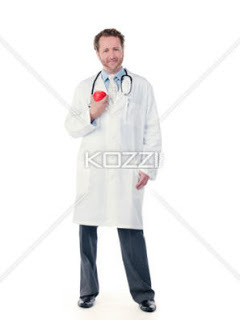 Portrait of a happy young doctor holding an apple over white background, Model: Derek Gerhardt
