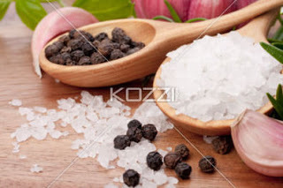 Fresh herbs and salt spoon on vintage wooden background. Shallow focus.