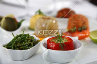 Selective focus on bruschetta with olives,cheese and vegetables in the middle